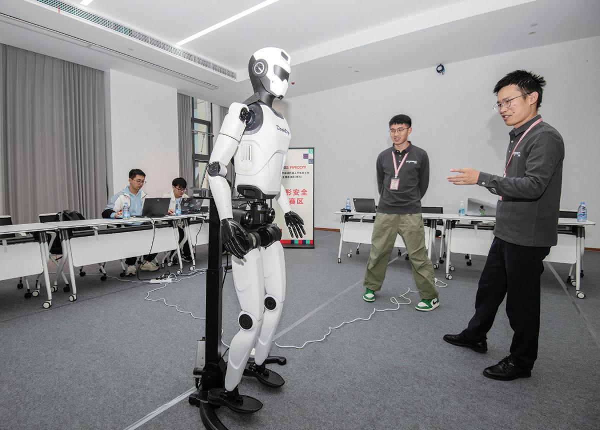 18日,在黃石市機(jī)器人產(chǎn)業(yè)創(chuàng)新發(fā)展交流會上,裁判官在評審設(shè)計完成的人形機(jī)器人。記者 石勇 攝
