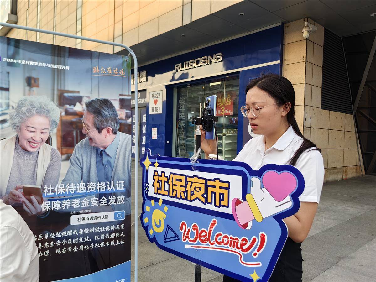 晚上7點(diǎn),襄陽市樊城區(qū)泛悅城市廣場,一塊醒目的“社保夜市”宣傳板在夜色中格外亮眼。幾張長桌整齊排開,工作牌與宣傳資料有序擺放,桌前“城鄉(xiāng)居?!薄搬t(yī)療保險(xiǎn)”“工傷保險(xiǎn)”等業(yè)務(wù)立牌清晰明了,辦理流程一目了然。
