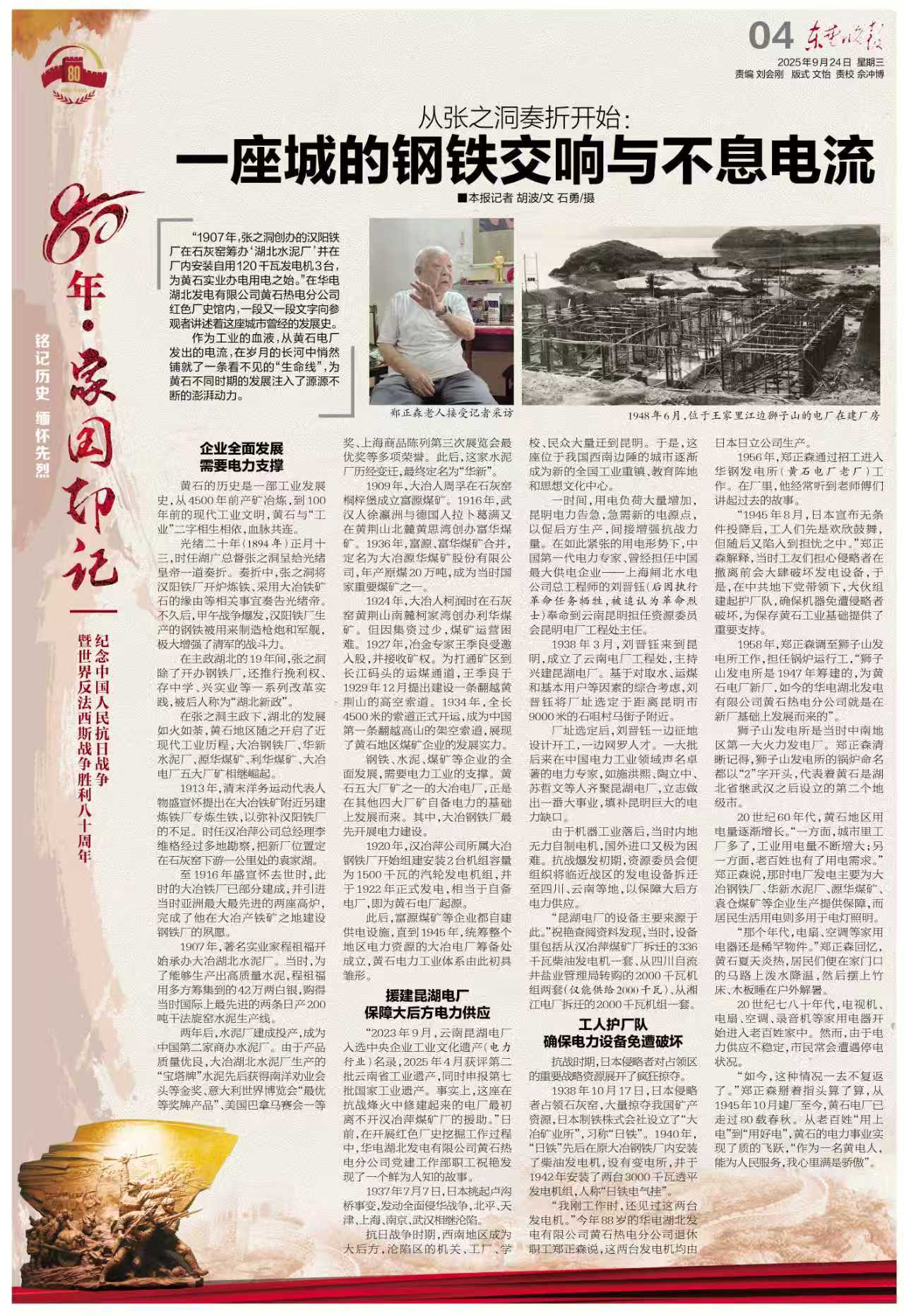 “1945年8月,日本宣布無條件投降后,工人們先是歡欣鼓舞,但隨后又陷入到擔(dān)憂之中?!编嵳忉?,當(dāng)時工友們擔(dān)心侵略者在撤離前會大肆破壞發(fā)電設(shè)備,于是,在中共地下黨帶領(lǐng)下,大伙組建起護(hù)廠隊(duì),確保機(jī)器免遭侵略者破壞,為保存黃石工業(yè)基礎(chǔ)提供了重要支持。